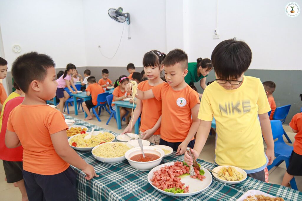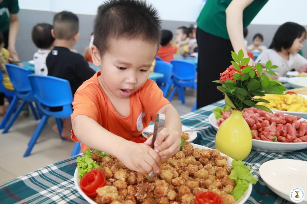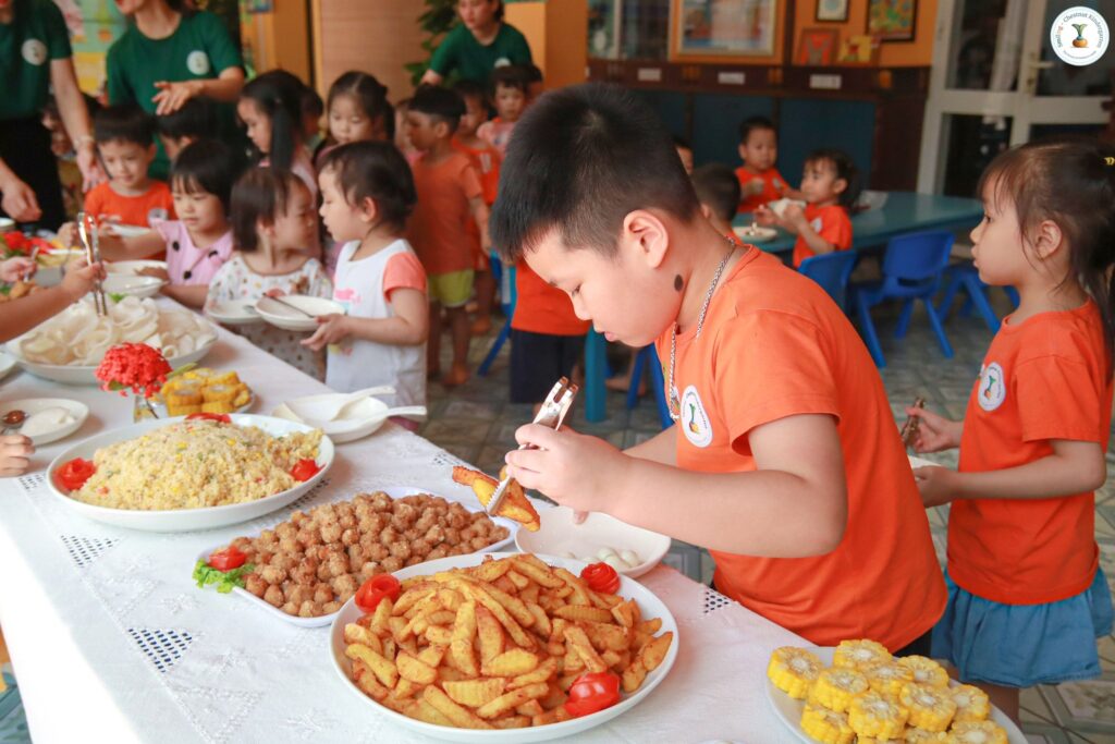 Tiệc buffet luôn được các bạn chờ đợi bởi thực đơn “toàn món mà con thích nhất trần đời”, khoai tây chiên giòn rộp, thịt viên mềm và thơm, cơm rang ngũ sắc ngọt lịm, không thể thiếu mỳ ý thơm lừng và các món ăn vặt, tráng miệng ngon tuyệt nữa! Thực đơn của tiệc buffet luôn là một món quà bí mật mà các cô chú nhân viên bếp dành tặng cho các bạn nhỏ, để khi đứng trước bàn tiệc ngon lành bạn nào cũng oà lên thích thú khi nhìn thấy món ăn yêu thích của mình.