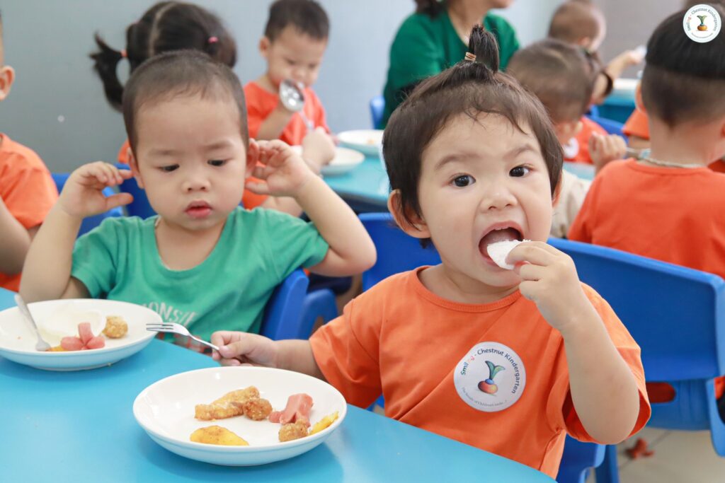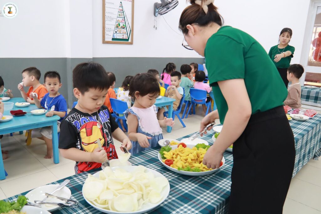 Khi cùng nhau thưởng thức bữa tiệc, các bạn nhỏ Hạt Dẻ Cười cũng được các cô hướng dẫn từng bước nhỏ một các nghi thức ăn uống lịch sự như xếp hàng chờ lấy đồ ăn, lấy lượng thức ăn vừa đủ cho mình, cách cầm đĩa, cầm bát, cầm kẹp đồ ăn sao cho đúng và vệ sinh, và cả cách quan sát cả bữa tiệc để lấy món ăn mình thích một cách lịch sự nữa… Tất cả đều là những bài học nho nhỏ mà các con được chỉ dạy qua các hoạt động mà các con trải nghiệm ở trường, vì thế, với tinh thần vui học, học qua trải nghiệm mà các con luôn hào hứng khám phá những điều mới mẻ, từng bước nhỏ hoàn thiện các kỹ năng và học hỏi thêm thật nhiều điều hay.